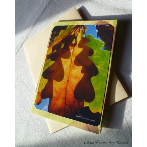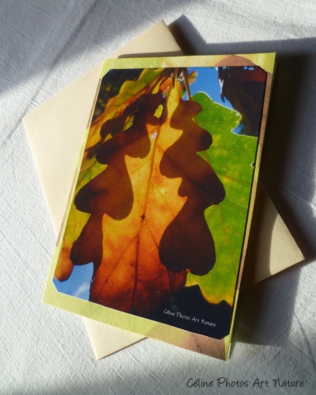 J'ai donc créé cette carte double artisanale qui est réalisée avec l'impression de ma photo de feuilles signée collée sur du papier 180g ,lui-même imprimé avec une autre de mes photos,une très jolie impression de superposition qui donne du relief et de la volupté à la carte.L'intérieur est également imprimé couleur verte anis.